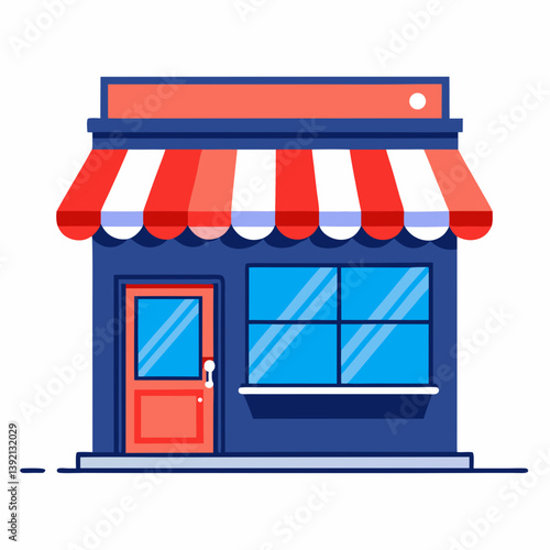 Cafe, bakery or shop facade with entrance door and glass windows with striped awnings, vector illustration. Small street shop exterior, brick storefront.