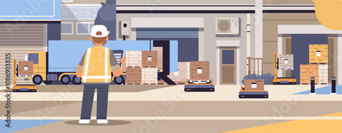 Storekeeper, forklift operator and loader with loading cart full of cardboard boxes working in warehouse, flat vector illustration. Receiving, shipping and storage of goods.