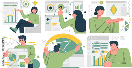 Vector illustration of big strategy dashboard and tiny people employees working toward common goals. Strategic project scheduling, planning and management concepts for web banner, website page etc.