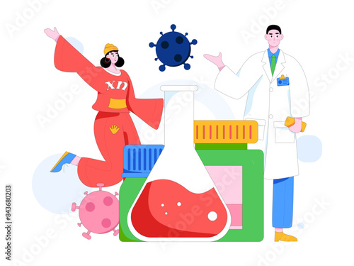 Miniature people male and female characters making delicious ice cream with strawberry and chocolate, vector flat illustration. Ice cream production and selling concept for poster, banner etc.