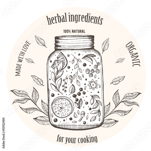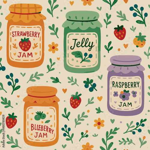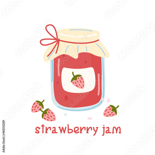 Strawberry jam ads. Vector realistic strawberry jam glass jar and hand drawn fresh strawberry, cherry, raspberry, blueberry, copy space. Fruit jam banner, poster design template.