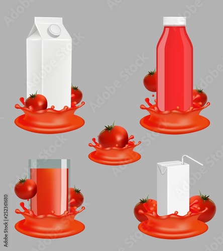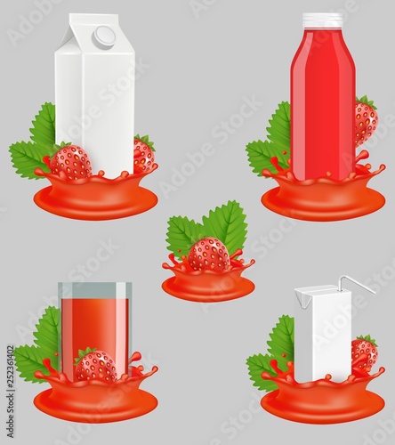 Strawberry juice package mockup set. Vector realistic illustration of natural fruit juice in glass, plastic bottle and carton pack with liquid splash, ripe fresh berries and leaves.