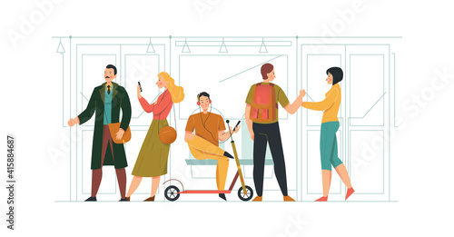 Cute dogs and cats sitting in cages and waiting for new owners. Happy couple adopting pet dog, flat vector illustration. Pet shelter. Adoption of stray and homeless animals.