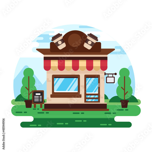 Street coffee concept vector illustration in flat style. Coffee shop, stall, kiosk, salesgirl and buyer with coffee.