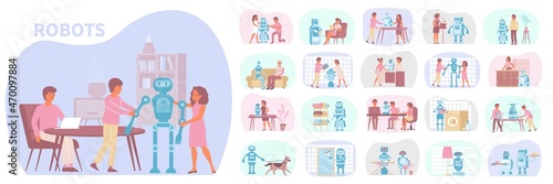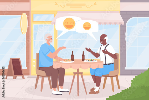 Street food festival scene set with happy people characters. Holiday meal preparation and sale, festive dinner eating, truck service providing vector illustration