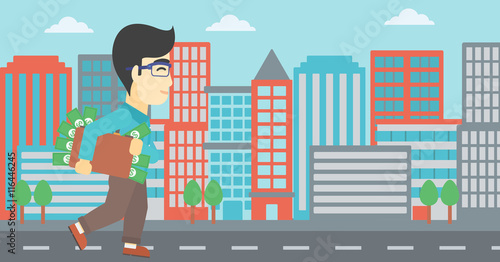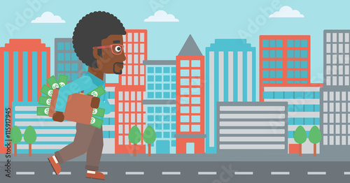Street food shop vector poster template. Happy shopper male character with shopping cart full of food products in front of grocery store window, flat style design illustration.
