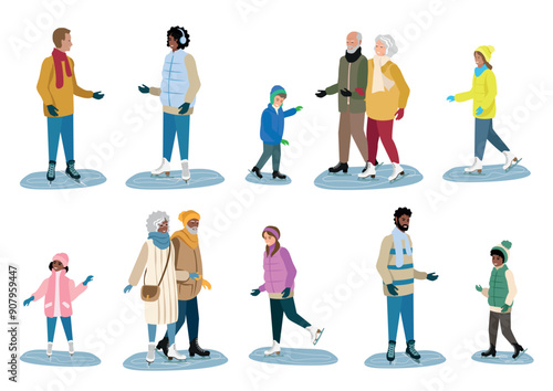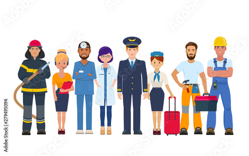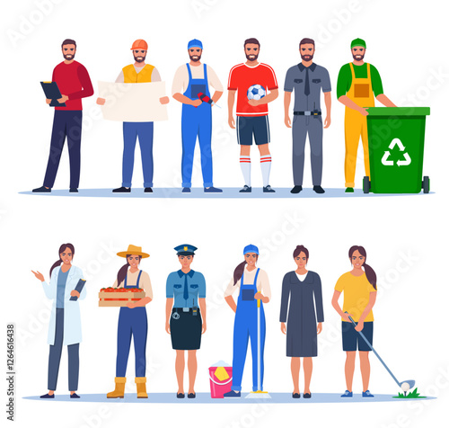 Vector street people icon set. Janitor or street sweeper, icecream salesman, skateboarder, taxi driver and young man in headphones listening to music flat style design elements.