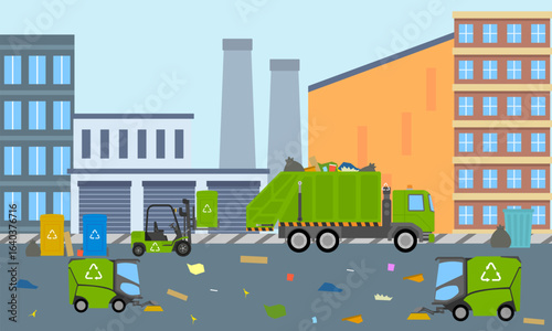 Street traffic concept vector illustration in flat design. Automobiles going across the main street. People waiting for city bus at the bus stop. Woman hailing a taxi.