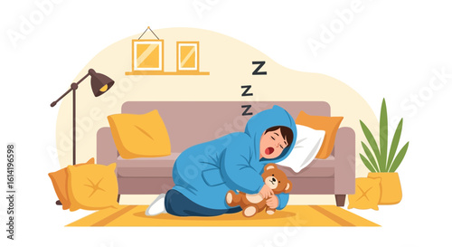 Tired stressed dad working on computer while naughty kid preventing him doing his work, flat vector illustration. Remote work, freelance. Parental stress, parenting problems when raising children.
