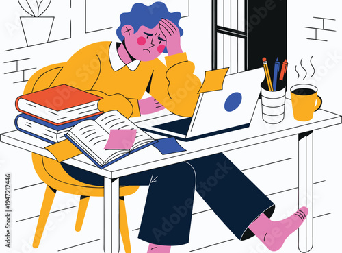 Stressed office worker at table vector icon isolated on white background