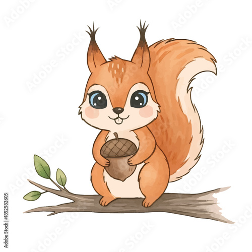 Small strong squirrel and acorn heap vector. Fur rodent showing power muscle gesture sitting near organic ripe oak seeds pile isolated on white background