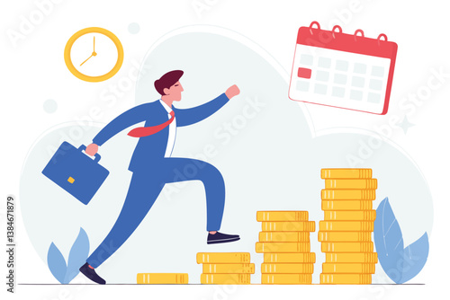 Successful businessman standing on gold ingot with trophy cup in raised hands, flat vector isometric illustration. Business success, financial growth concept.
