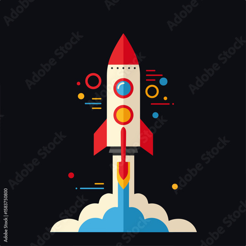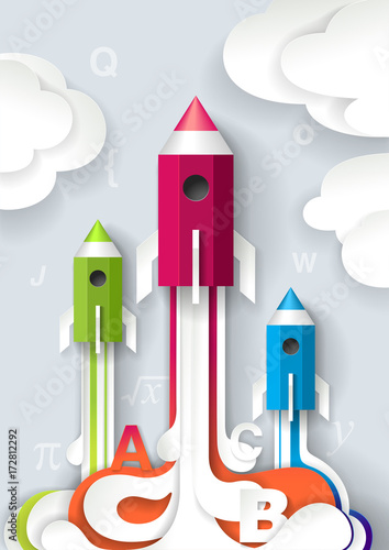 Successful school start vector illustration with pencil rockets flying into space, abc letters. Back to school concept.