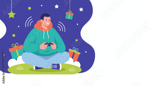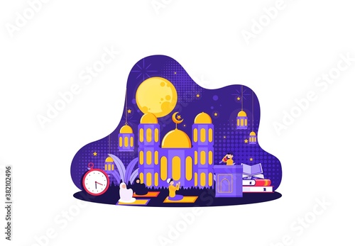 Summer bbq scene. Happy romantic couple sitting at campfire, drinking tea late at night, flat vector illustration. Young man and woman talking to each other. Outdoor barbeque picnic, bbq party.