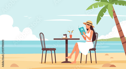 Summer beach vacation landing page design, website banner template set, flat vector illustration. Happy female characters taking rest at the seaside. Summer holiday, tropical vacation.