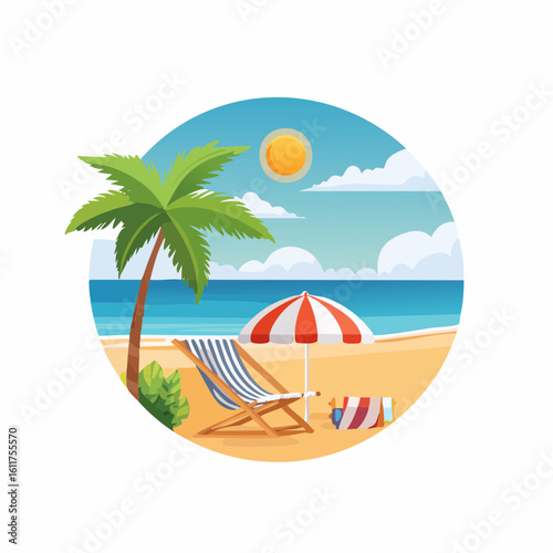 Summer beach vector paper cut illustration. Ocean beach with chaise lounge, tropical palm leaves and starfish in circle. Beach holidays concept for poster, banner, summer card.