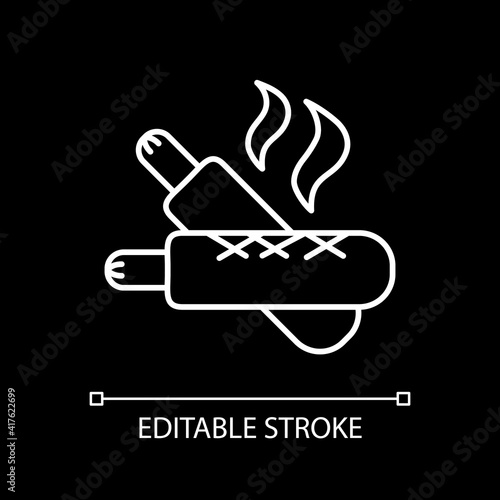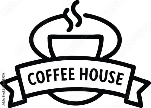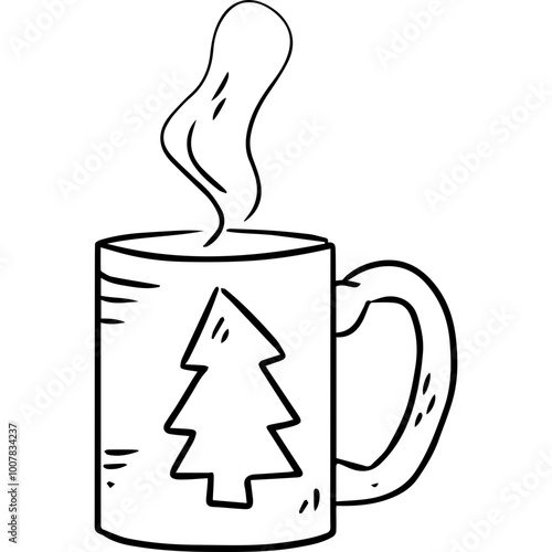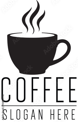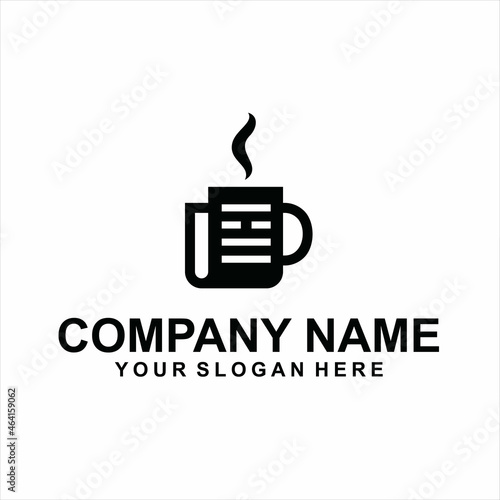 Summer camp vintage logo with steaming tea mug over mountain peak. Outdoor adventure in wild forest camp badge isolated on white background. Eco travel and tourism
