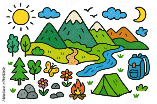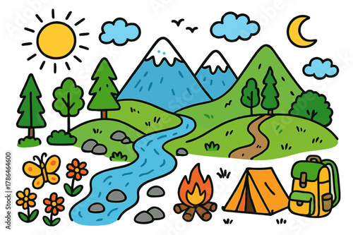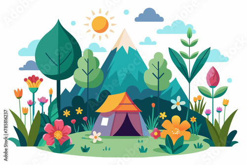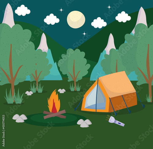 Summer camping in forest, vector illustration in paper art style. Tourist tent and campfire on forest glade. Hiking, trekking, summer vacation poster, banner template.