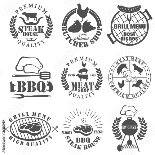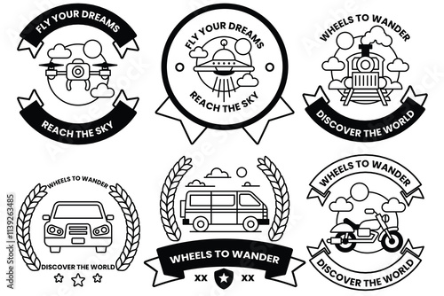 Summer camping label set, vector monochrome illustration. Vintage logos, badges, emblems with forest, tent, metal cup, axe, campfire, camper van and other camping symbols.