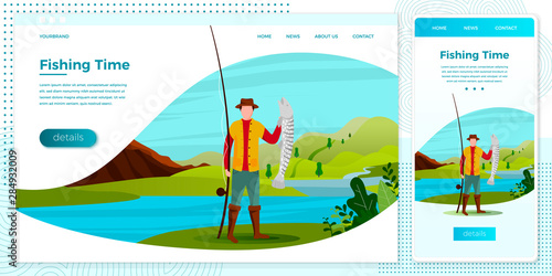 Camping landing page website template. Vector illustration of people standing next to campfire and tent in forest. Summer camping, hiking, trekking concept.