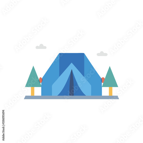 Summer camping, vector illustration in paper art style. Tourist tent on river bank, boat on water, forest hill landscape. Hiking, trekking, fishing, outdoor adventure tourism industry.