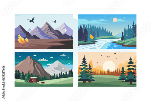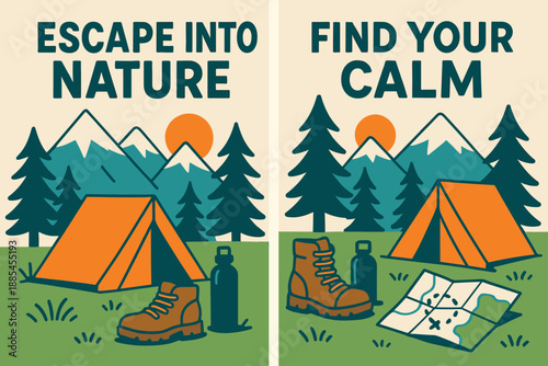 Summer camping vector paper cut banner set. Welcome adventure camp web templates with day and night sky, forest, mountains, lake, campfire and tent.