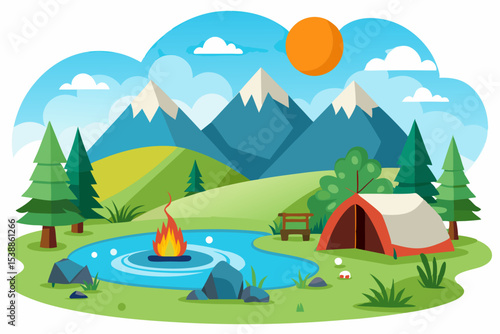 Summer camping background in circle with forest, mountains, lake, campfire and tent. Vector illustration in paper art style.
