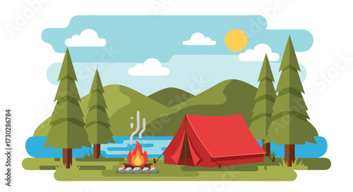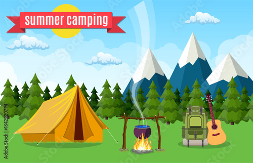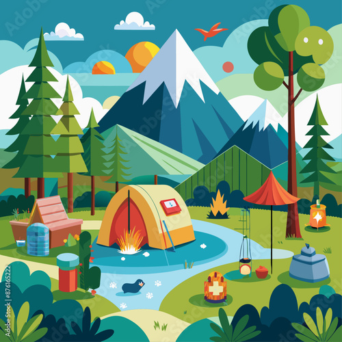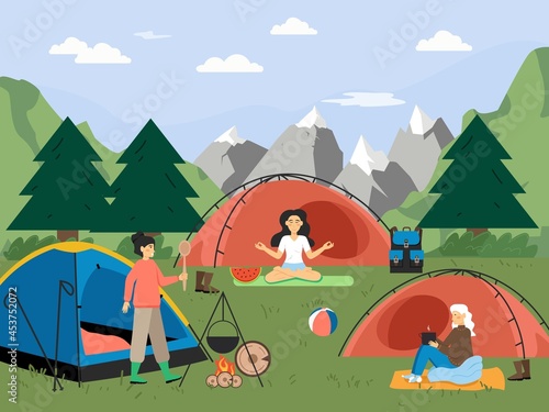 Summer hiking. Campsite with camping tents and happy women meditating, cooking meal on fire, drinking tea, flat vector illustration. Trekking, expedition, travel adventure, nature tourism, camping.