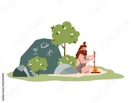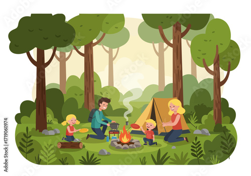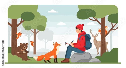 Summer picnic. Happy girl lying on blanket and using mobile phone, flat vector illustration. Picnic basket. Young people lifestyles. Social media and smart phone addiction.