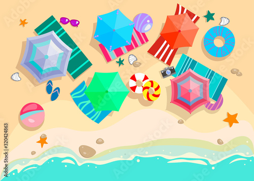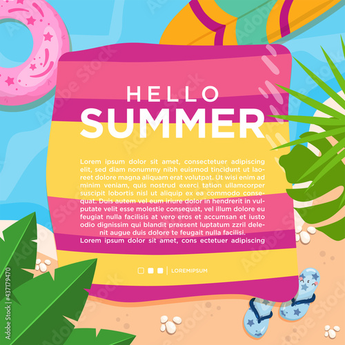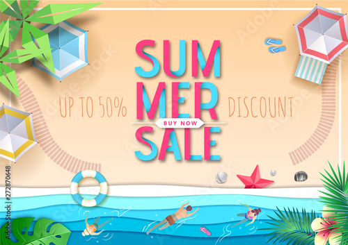 Summer sale concept vector banner. Tropical beach in paper art style. Top view paper cut illustration. Summer holiday vacation poster template. Craft origami.