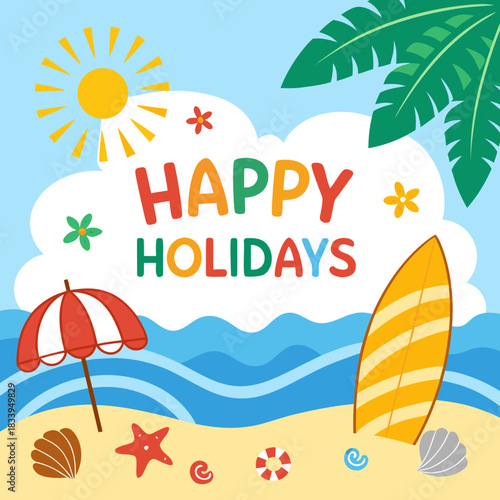 Summer sale poster, banner template. Vector paper cut ocean waves, beach, palm leaves, umbrella, flip-flops, sunglasses and starfish.