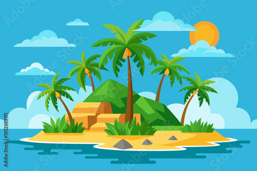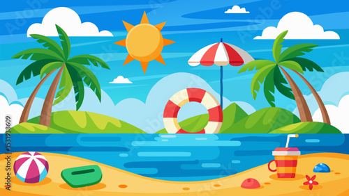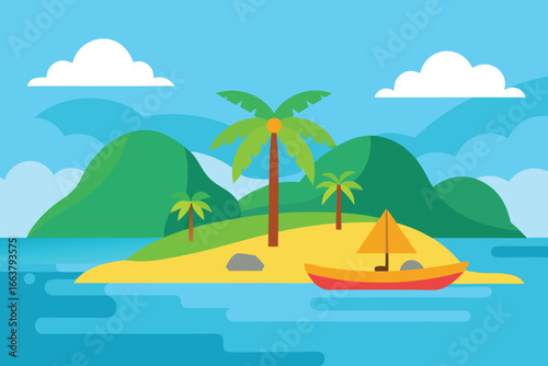 Summer sea beach vector. Travel paper cut art poster. Tropical holiday vacation background. Origami island with palm tree, ocean water wave and sky. Adventure and tourism