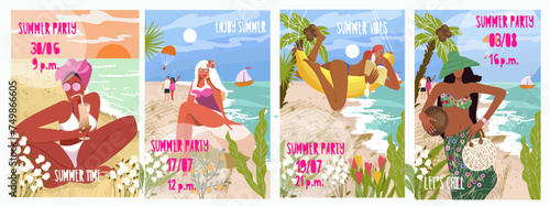 Summer vacation on tropical beach holiday concept vector illustration. People play volleyball on sand. Couple drink wine and watch sunset in a park. Friends at picnic, outdoor activity.