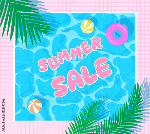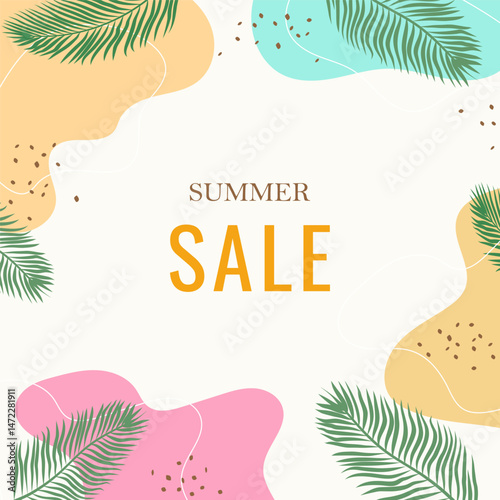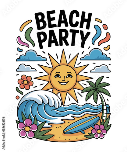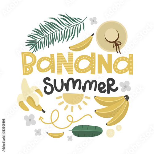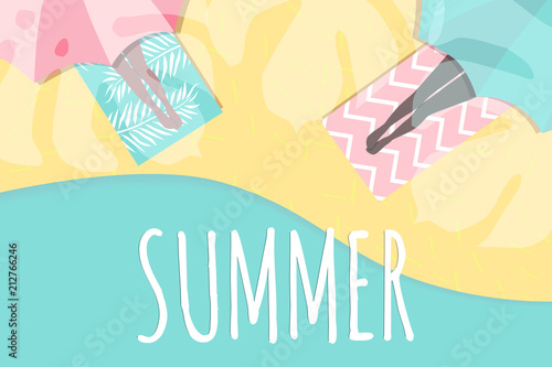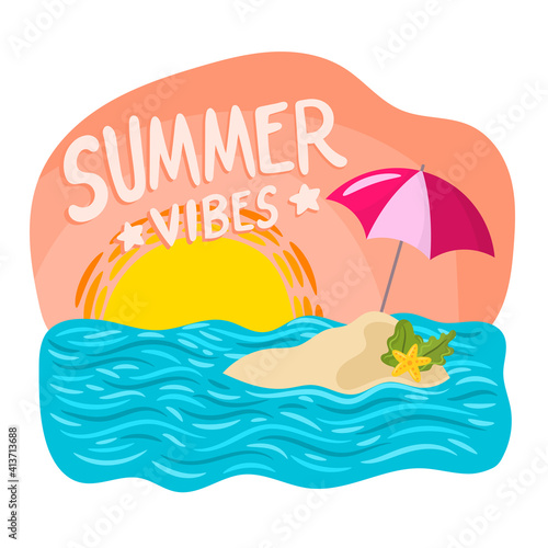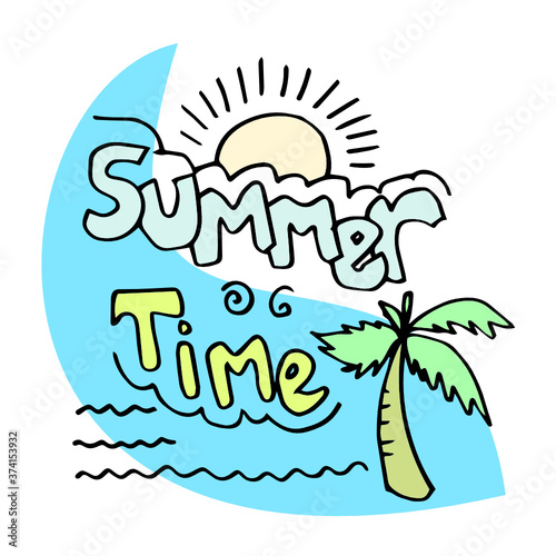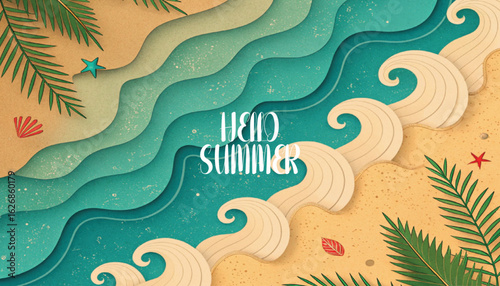Summer creative hand lettering typography, vector illustration in paper art modern craft style. Summer tropical beach composition with paper cut ocean waves, palm tree, sun, starfish and seagulls.
