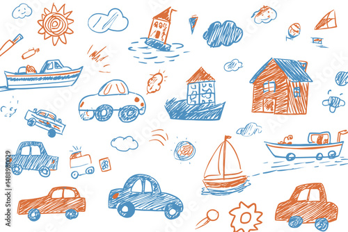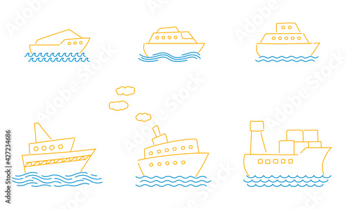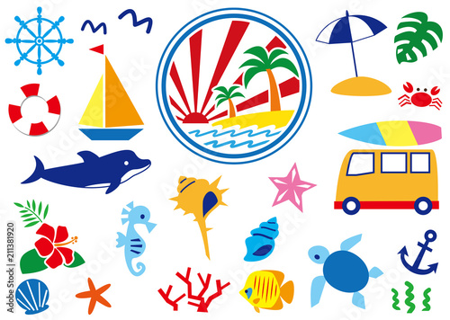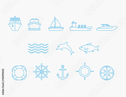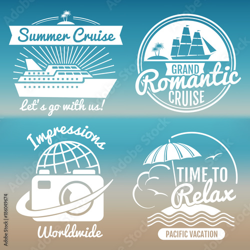 Summer time travel vintage logo, label, badge set, vector illustration. Surfing, kayaking summer camp, sea cruise, yacht trip, voyager adventure white emblems on blue background.