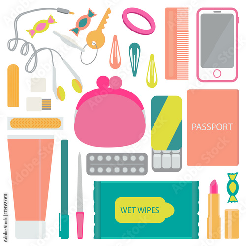 Travel infographic, vector flat isolated illustration. Summer beach vacation accessories. Documents, money, clothes, footwear, medicine, gadgets and cosmetics. Summertime and travel planning concept.