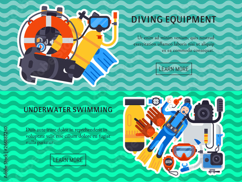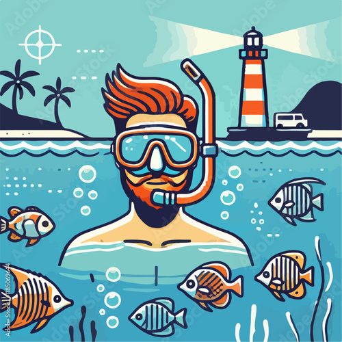 Summer vacation vector flat illustration. Beach accessories flip flops, sunglasses, starfish, slice of watermelon exotic fish scuba mask and hand holding sunscreen. Summer beach holidays poster banner