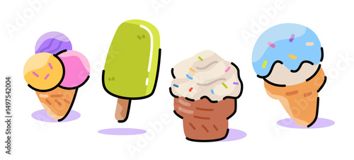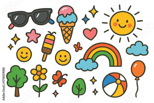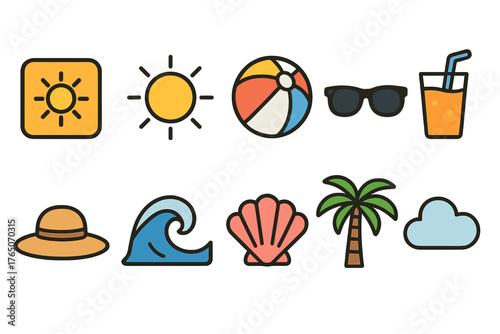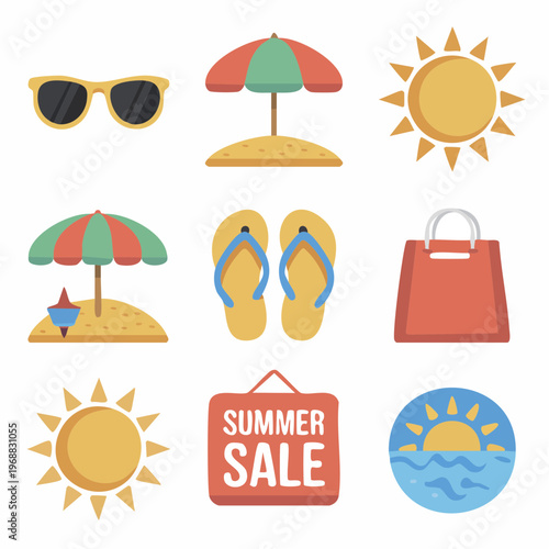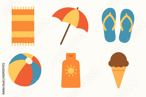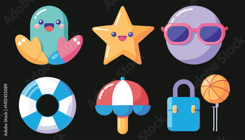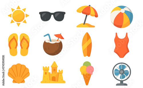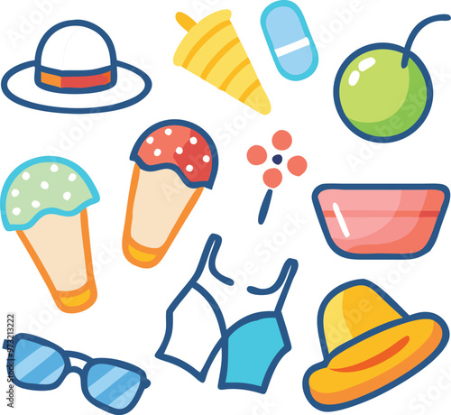 Summer icon isolated vector set. Sunscreen, sunglasses, inflatable ball, ice-cream, slippers, sun, luggage bag, watermelon slice, diving snorkeling mask holiday vacation item illustration