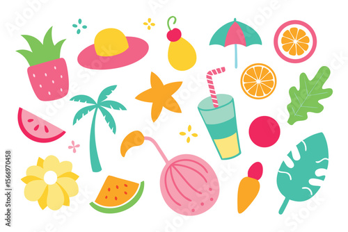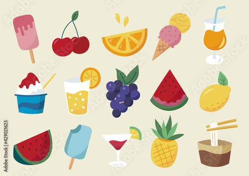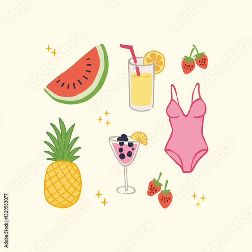 Summer seamless pattern. Vector hand drawn ice cream cones, coconut milk, pineapples and slices of watermelon.