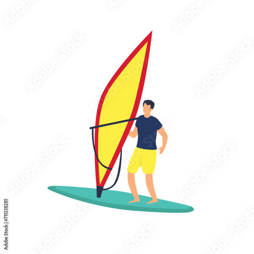 People enjoying extreme summer water sports, vector flat illustration isolated on white background. Stand up paddle boarding, windsurfing, water scooter, snorkeling, surfing. Summer beach activities.
