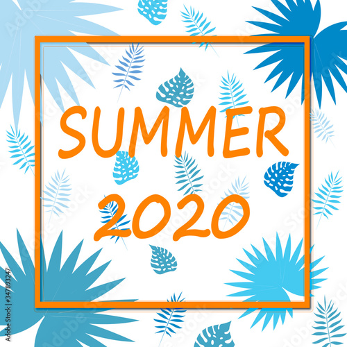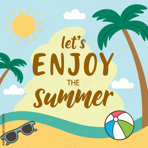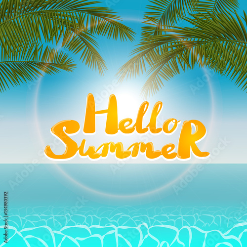 Summertime vector paper cut illustration. Tropical landscape with ocean waves, sand, palm leaves, beach umbrella, flip-flops, sunglasses, starfish. Beach holidays poster, banner summer card template.