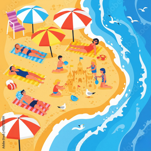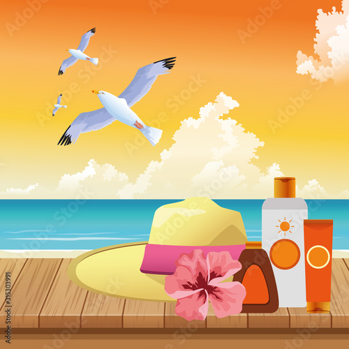 Sunscreen advertisement. Vector summer seaside beach illustration in paper cut art craft style. New cosmetic product promotion design