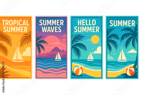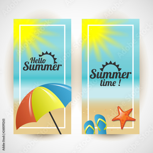 Sunscreen packaging tubes, paper cut exotic beach background, parasol, flip flops, glasses in round frame, vector illustration. Sunburn protection cream, summer beauty cosmetic product ads template.
