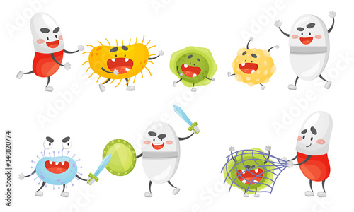 Superhero tablet stop bacteria vector illustration. Super hero pill in mask and cloak holding prohibition sign standing front of naughty angry virus or microbe. No infection, fight against infection outbreak
