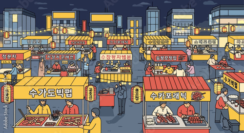 Supermarket interior vector illustration in flat style. Customers buy products in food store. Groceries and foodstuff on shelves. People shopping.