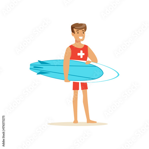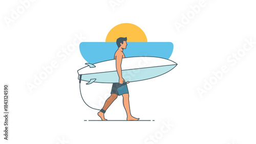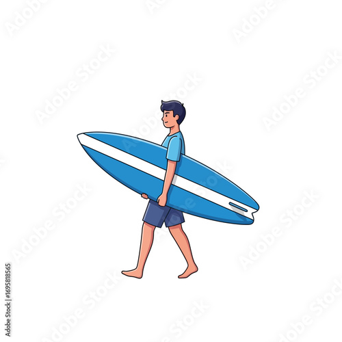 Vector illustration of surfer carrying surfboard. Summer people concept flat style design element, icon isolated on white background.