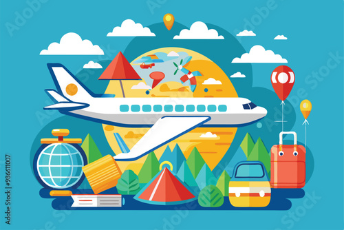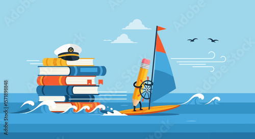 Surfing vector flat style design illustration. Surfboard, wetsuit, mask, water scooter, sunscreen, coconut cocktail and ocean wave. Surfing equipment, clothing and accessories for web banner, webpage.