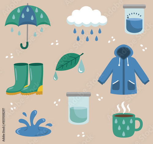 Surfing vector flat style design illustration. Surfboard, wetsuits, mask, sunglasses, sunscreen, coconut cocktail and ocean wave. Surfing equipment and gear composition for web banner, webpage etc.