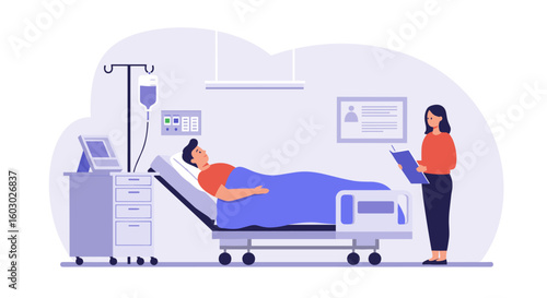 Vector illustration of doctor surgeon and patient lying on operating table. Medical practitioner flat style design element, icon isolated on white background.