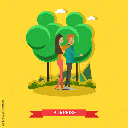 Vector illustration of happy girl covering boyfriend eyes with her hands. Surprise concept flat style design element.